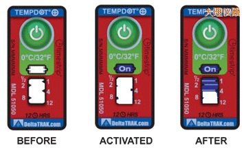 TempDot™Plus標(biāo)簽應(yīng)存儲(chǔ)在室溫下,,并必須在反應(yīng)溫度閾值以上被激活。激活是通過用手指推壓。"On"字出現(xiàn)在第一個(gè)窗口中顯示激活。之后5分 鐘內(nèi),,在反應(yīng)溫度或低于反應(yīng)溫度的情況下將標(biāo)簽貼到產(chǎn)品上。藍(lán)色染料熔化并以控制的速率遷移,經(jīng)過白色大窗口。這表示暴露在溫度閾值以上的累計(jì)時(shí)間。當(dāng)溫 度低于閾值時(shí),,該染料固化并停止移動(dòng)。如果溫度超過閾值,TempDot®Plus標(biāo)簽提供即時(shí)的視覺跡象。