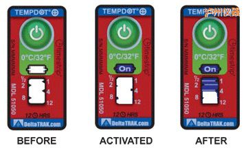 TempDot™Plus標(biāo)簽應(yīng)存儲在室溫下,并必須在反應(yīng)溫度閾值以上被激活。激活是通過用手指推壓。"On"字出現(xiàn)在第一個窗口中顯示激活。之后5分 鐘內(nèi),在反應(yīng)溫度或低于反應(yīng)溫度的情況下將標(biāo)簽貼到產(chǎn)品上。藍(lán)色染料熔化并以控制的速率遷移,,經(jīng)過白色大窗口。這表示暴露在溫度閾值以上的累計時間。當(dāng)溫 度低于閾值時,,該染料固化并停止移動。如果溫度超過閾值,,TempDot®Plus標(biāo)簽提供即時的視覺跡象。