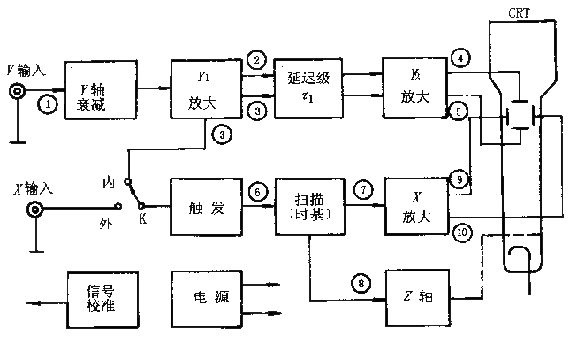 被測(cè)信號(hào)①接到“Y"輸入端經(jīng)Y軸衰減器適當(dāng)衰減后送至Y1放大器(前置放大)推挽輸出信號(hào)②和③。經(jīng)延遲級(jí)延遲Г1時(shí)間到Y(jié)2放大器。放大后產(chǎn)生足夠大的信號(hào)④和⑤加到示波管的Y軸偏轉(zhuǎn)板上。為了在屏幕上顯示出完整的穩(wěn)定波形將Y軸的被測(cè)信號(hào)③引入X軸系統(tǒng)的觸發(fā)電路在引入信號(hào)的正(或者負(fù))極性的某一電平值產(chǎn)生觸發(fā)脈沖⑥啟動(dòng)鋸齒波掃描電路(時(shí)基發(fā)生器)產(chǎn)生掃描電壓⑦。由于從觸發(fā)到啟動(dòng)掃描有一時(shí)間延遲Г2為保證Y軸信號(hào)到達(dá)熒光屏之前X軸開始掃描Y軸的延遲時(shí)間Г1應(yīng)稍大于X軸的延遲時(shí)間Г2。掃描電壓⑦經(jīng)X軸放大器放大產(chǎn)生推挽輸出⑨和⑩加到示波管的X軸偏轉(zhuǎn)板上。z軸系統(tǒng)用于放大掃描電壓正程并且變成正向矩形波送到示波管柵極。這使得在掃描正程顯示的波形有某一固定輝度而在掃描回程進(jìn)行抹跡。