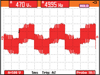 50 Hz馬達(dá)驅(qū)動輸出電壓的脈寬調(diào)制信號的細(xì)節(jié)。1000V,50 微秒的脈沖即導(dǎo)致某些測試設(shè)備的不穩(wěn)定。