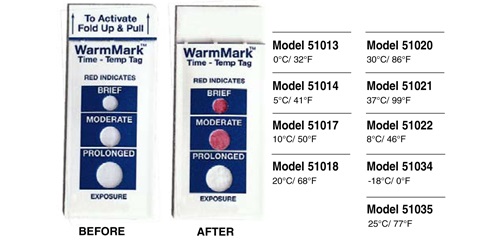 溫度指標(biāo)標(biāo)簽是體積小、成本低的溫度指示標(biāo)簽或時(shí)間/溫度標(biāo)簽,,使用于食品運(yùn)輸、儲(chǔ)存或處理過(guò)程。典型的用途包括監(jiān)測(cè)藥品、化學(xué)品和新鮮農(nóng)產(chǎn)品在運(yùn)輸過(guò)程中德溫度。如果溫度超出預(yù)設(shè)的限制之外,,標(biāo)簽顯示變色。 DeltaTrak提供滿足你各種需要的標(biāo)簽:WarmMark溫度標(biāo)簽、高溫?zé)針?biāo)簽和TempDot時(shí)間溫度指示標(biāo)簽顯示溫度變 化超過(guò)預(yù)設(shè)的時(shí)間。FreezeCheck和ColdMark溫度標(biāo)簽用于顯示運(yùn)輸溫度低于0℃。商業(yè)洗碗機(jī)使用的TempDot高溫?zé)針?biāo)簽可顯示最終沖 洗水溫是否達(dá)到71℃(HACCP體系所要求的溫度)。 WarmMark 溫度標(biāo)簽,,型號(hào)51013-51035,, 監(jiān)控產(chǎn)品在運(yùn)輸、 儲(chǔ)存或處理過(guò)程中的溫度。反應(yīng)溫度范圍可從-18℃至37℃。這些不干膠標(biāo)簽直接適用于產(chǎn)品、包裝、紙箱或大包裝上。一旦反應(yīng)溫度達(dá)到或超過(guò),,標(biāo)簽便被激 活而發(fā)生不可逆變色。紅色顯示溫度的閾值外暴露經(jīng)過(guò)了一個(gè)短暫,,中等或長(zhǎng)久的時(shí)間段。你一眼便能看出是否有溫度閾值外暴露發(fā)生,,提供質(zhì)量保證的永久記錄。