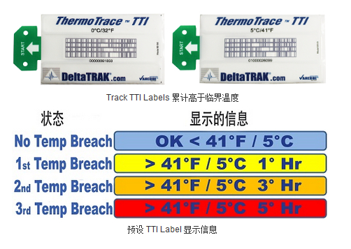 DeltaTrak 的冷藏鏈解決方案包括 ThermoTrace TTI 標(biāo)簽和 ThermoTrace TTI 服務(wù)。TTI 標(biāo)簽是一個低成本的一次性的條碼標(biāo)簽,支持各種預(yù)定的時間和溫度。基于驗證的 (無毒) 化學(xué)過程,條碼會由跟蹤三個不同水平的溫度變化累積而改變。這個動態(tài)過程在每次條碼掃描時被實時地記錄。
